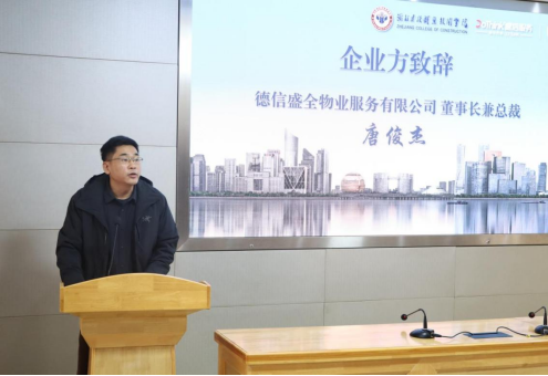 德信盛全服务董事长兼总裁唐俊杰在致辞中介绍了德信盛全物业的发展历程、行业地位及人才战略。他表示,企业的发展离不开高素质人才的支撑,浙江建设职业技术学院在人才培养方面成果丰硕,双方合作基础坚实。盛全班的成立,是企业与学校实现共赢的重要契机,企业将充分发挥行业资源优势,为同学们提供真实的实践场景、专业的技术指导和广阔的发展空间,助力同学们成长为行业急需的实用型人才,期待与学校携手培养更多优秀学子,共同书写校企合作新篇章。